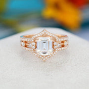 3PCS EMERALD CUT ROSE GOLD CLUSTER WEDDING BRIDAL MOISSANITE ENGAGEMENT RING SET