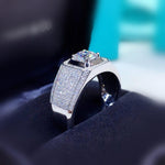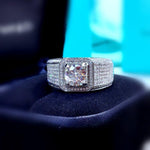 Men wear rings too! Elegant & Stylish Moissanite Ring for Men in 18k White Gold. The center Moissanite is 1.5ct. The gold band is set with many little moissanite.