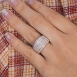 Stylish wide ring with 8 rows of sparkling colorless D-Grade Moissanite. The total width of the ring is 6mm. This ring is handcrafted with a precious metal of your choice (silver or gold). This ring sparkles immensely in the sunlight and even indoors!